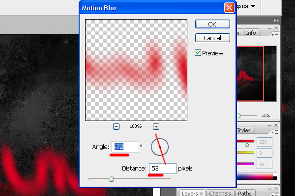 Temporarily turn off the visibility of the text layer and go to Filter > Blur > Motion Blur.